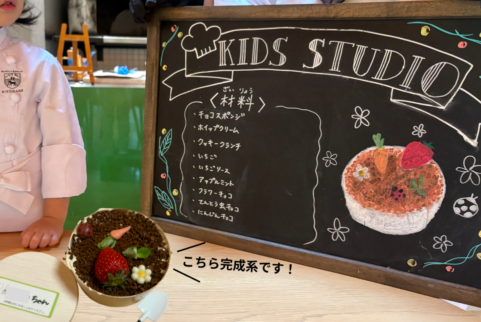 予約時間になったら、アクティビティの拠点である「POKO POKO」へ。可愛いパティシエの衣装に着替えて手を洗ったら、早速ケーキ作りスタート! クリームを絞ったり、フルーツをデコレーションしたり、スタッフの方の説明を聞きながら真剣そのもの。親の手を借りずに、自分一人でどんどん作り上げていく姿に思わず感動してしまいました。