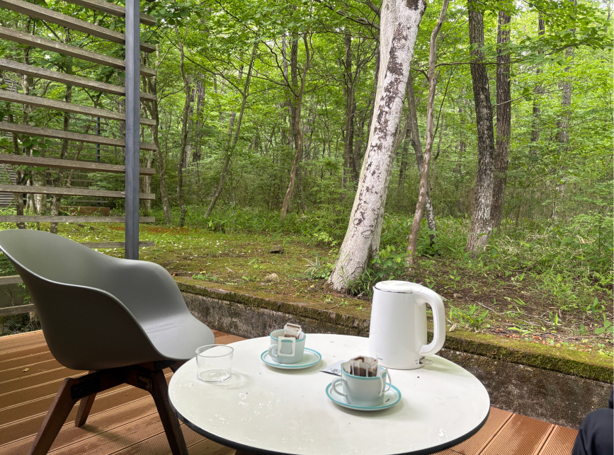 子ども二人を連れて温泉は大変なので宿泊当日の夜は部屋のお風呂を使い、翌日早起きして夫と優雅にテラスでコーヒーを飲んだ後、新鮮な空気を吸いながらのコーヒーは格別でした。その後私は朝風呂に向かいました。