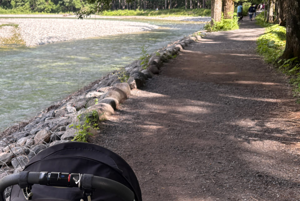 舗装されていない砂利道が多く、ベビーカーを押しにくい箇所も。特に河童橋から明神池方面は、ベビーカーを持ち上げる場面もありました。使い慣れた、タフなベビーカーで行くことをおすすめします。