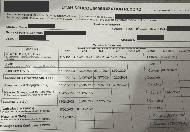 接種後、「接種履歴をください」とお願いしたら、すぐに対応してくださいました。これで学校への予防接種履歴の提出は余裕です!アメリカには日本の母子手帳がないため、この履歴は病院でしっかり管理するか、アプリからダウンロードして印刷できるようになっているようなのでお願いしないと履歴はもらえないと思います。なので接種後発行してもらえるか聞いてみることを強くおすすめします。